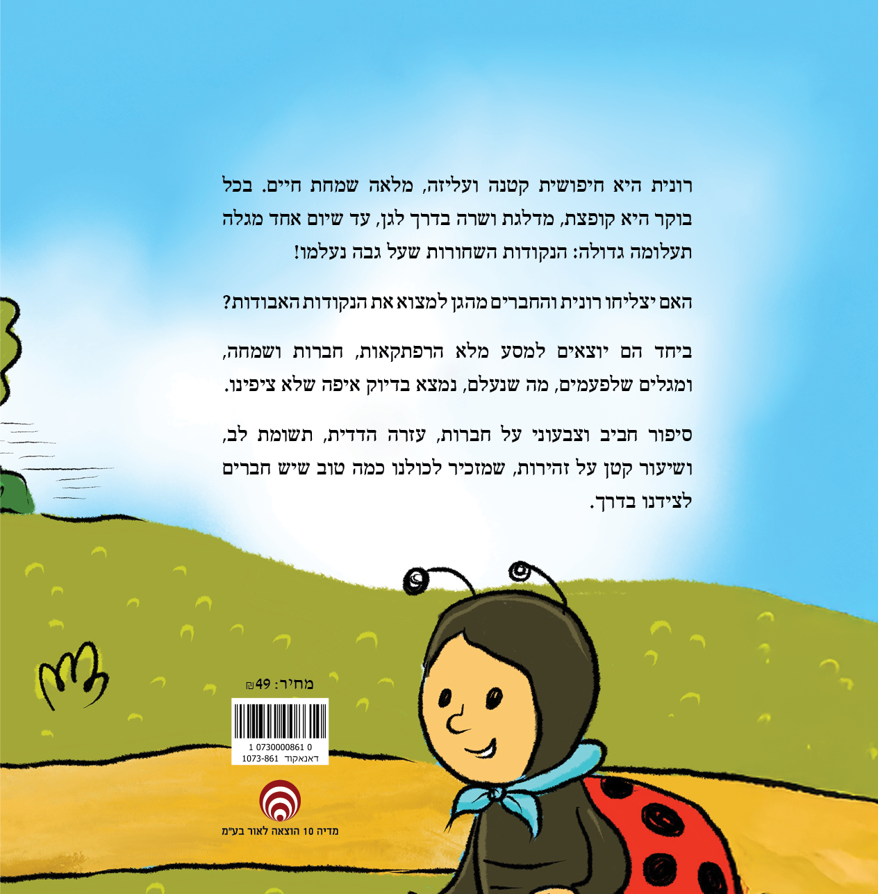 רונית היא חיפושית קטנה ועליזה, מלאה שמחת חיים. בכל בוקר היא קופצת, מדלגת ושרה בדרך לגן, עד שיום אחד מגלה תעלומה גדולה: הנקודות השחורות שעל גבה נעלמו!