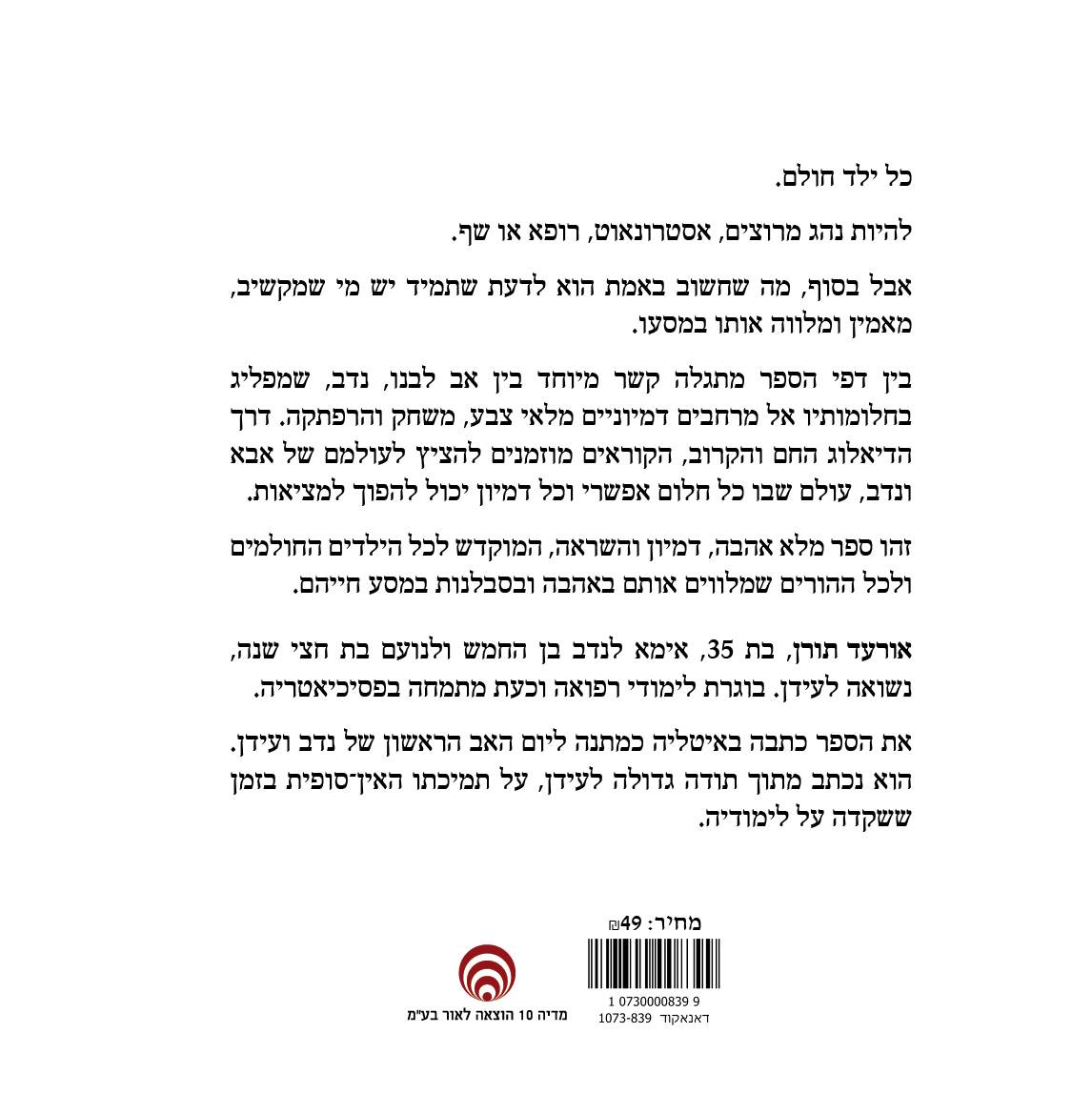 בין דפי הספר מתגלה קשר מיוחד בין אב לבנו, נדב, שמפליג בחלומותיו אל מרחבים דמיוניים מלאי צבע, משחק והרפתקה. דרך הדיאלוג החם והקרוב, הקוראים מוזמנים להציץ לעולמם של אבא ונדב, עולם שבו כל חלום אפשרי וכל דמיון יכול להפוך למציאות.